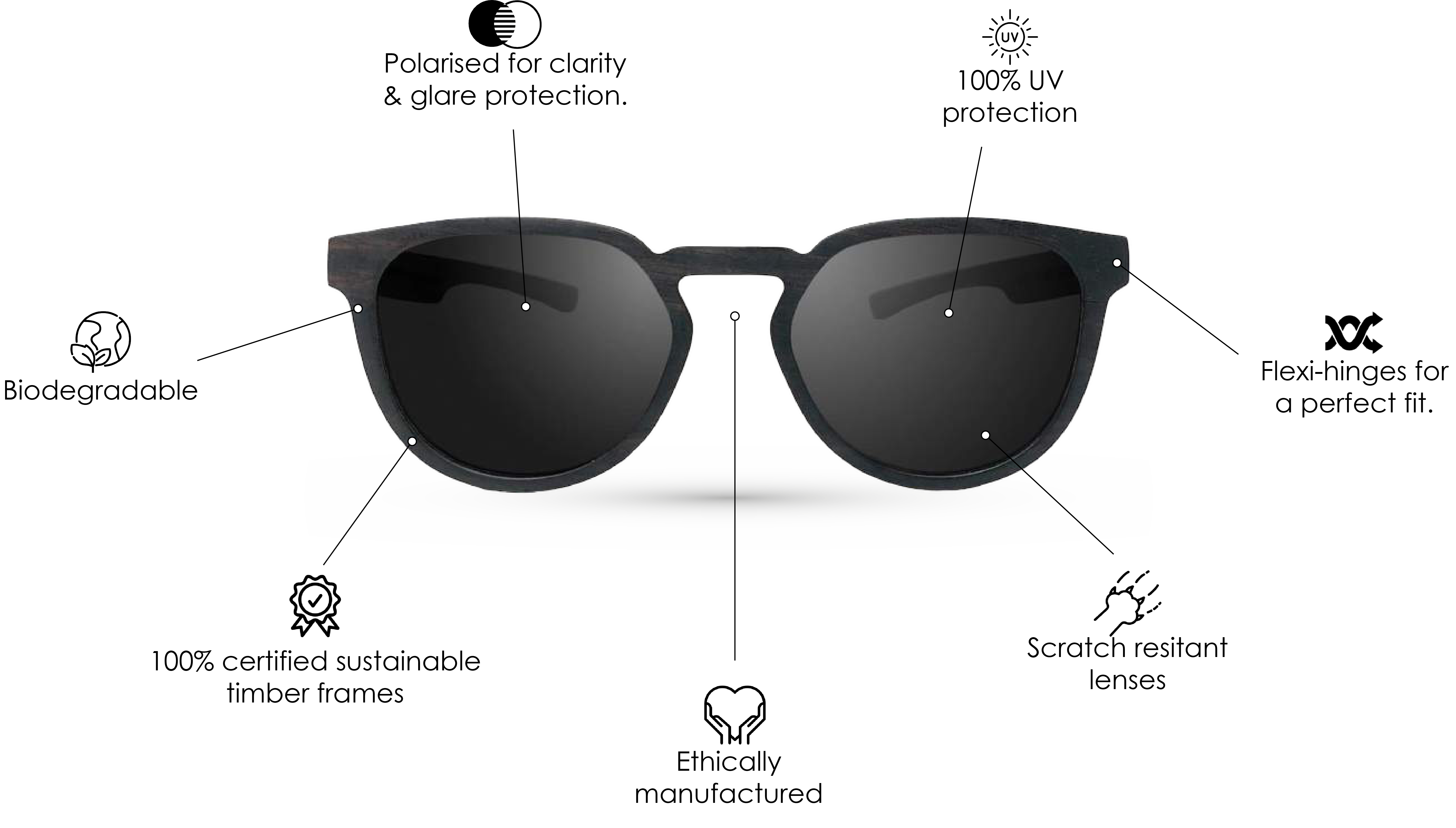 Made from certified timber and recycled polycarbonate frames, these sunglasses prioritise environmental responsibility. TAC Polarised UV400 lenses provide superior protection and clarity, while scratch and impact-resistant coatings ensure durability. Enjoy eco-conscious accessories like a recycled microfibre bag and cloth, and cork carry case. Choose our sunglasses for a fashionable and responsible eyewear solution.